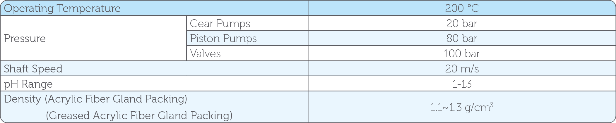 It is braided from high-strength acrylic synthetic fiber impregnated with PTFE in advance. The packing is re-impregnated with a special PTFE dispersion. This material has a tight structure, low friction, and chemical resistance.