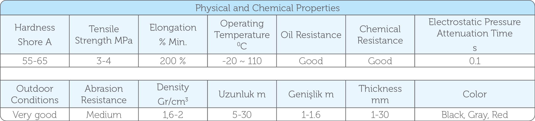 Specifically manufactured from NBR/SBR/NR to provide high insulation properties. It has a rapid electrical discharge capability.