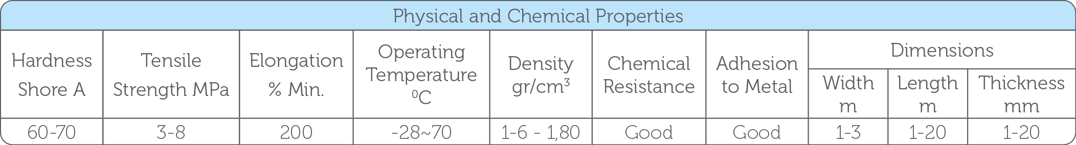 Fabric-reinforced NBR (Buna-N) sheet is used in areas where resistant material is required against oil, caustic substances, and aliphatic hydrocarbons.