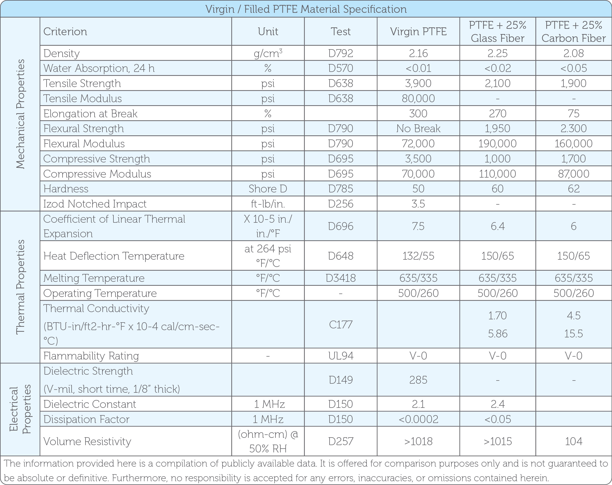 The table provides an overview of the properties of pure and filled PTFE materials. In fact, there are countless combinations of filler materials available, depending on the purpose of use. Among these, glass fiber-filled and carbon fiber-filled alloys are the most widely applied. The reinforcement material should be selected according to the importance of the feature to be highlighted.
