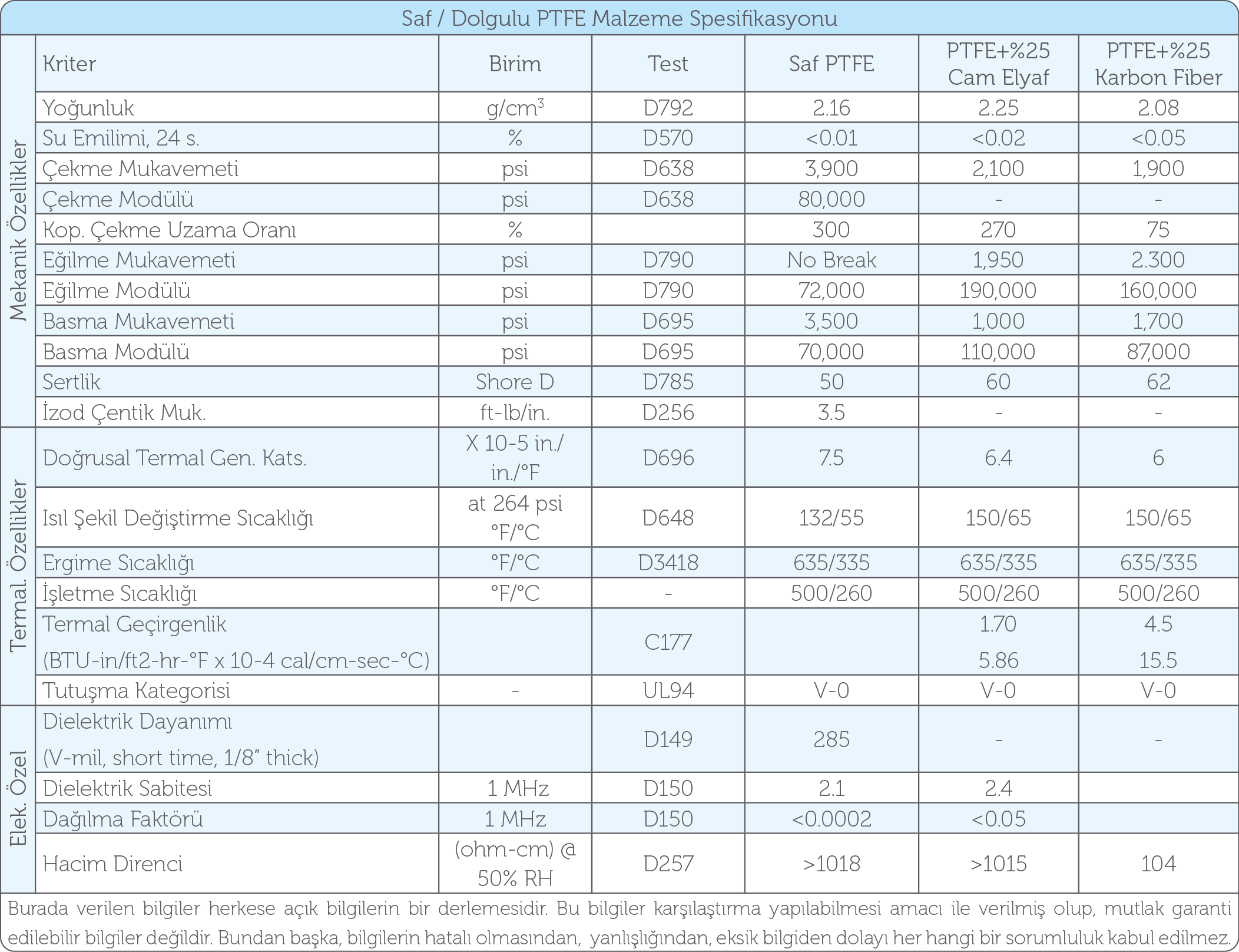 Tabloda bir fikir edinilmesi amacıyla saf ve dolgulu PTFE malzemelerin özellikleri verilmiştir. Aslında kullanım amacına göre sayısız dolgu malzemesi kombinasyonları mevcuttur. Bunlardan en çok uygulama alanı olan, cam elyaf dolgulu ve karbon fiber dolgulu alaşımlardır. Takviye malzemesi, öne çıkması istenen özelliğin önemine göre seçilmelidir.