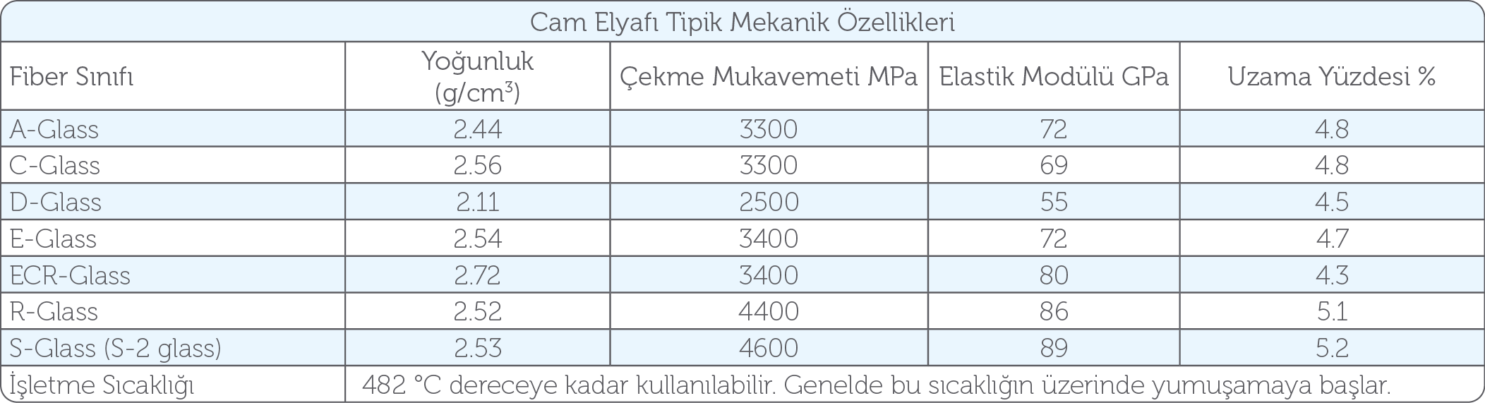 Cam elyaf esaslı ürünler, endüstriyel fırın ve kazanlarda, demir-çelik endüstrisinde, enerji santrallerinde, çimento fabrikalarında, denizcilikte, seramik ve cam endüstrilerinde çalışma sıcaklığı aralığında ısı yalıtımı sağlamak amacıyla kullanılmaktadır. Yüksek çekme dayanımına, boyutsal kararlılığa, yanmazlık özelliğine, iyi derece ısıl geçirgenliğe, iyi derece kimyasal dirence, mükemmel elektriksel özelliklere ve ekonomik olma avantajlarına sahiptir. Cam elyafı hammadde ve üretim yöntemine bağlı olarak beş farklı ürün grubuna ayrılırlar. Endüstride en çok kullanılan sınıflar “C-Glass (Chemical)”, “E-Glass (Elektriksel)” ve S-Glass (Mukavemet) tipleridir. “C-Glass” elyaf 450 °C’ye “E-Glass” elyaf ise 600 °C’ ye kadar dayanmaktadır. Ergime noktası yaklaşık 850 °C‘dir. Cam elyaf tekstil ürünler sıcaklık dayanımlarını artırmak için isteğe ve kullanıma bağlı olarak özel kaplamalarla da kullanıma sunulabilmektedir.