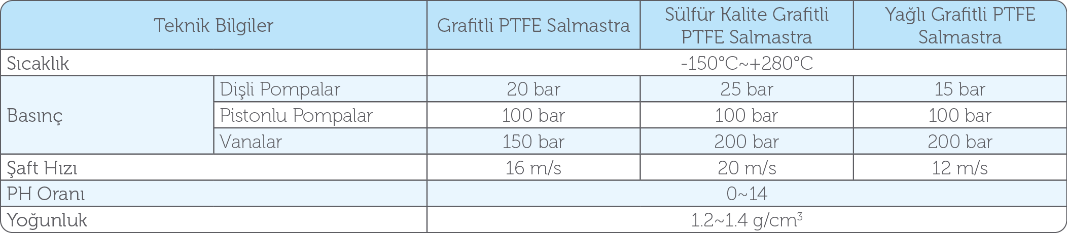 Özellikle yüksek hız ve sıcak ortamlarda saf PTFE salmastralara göre daha iyi sonuç verir.