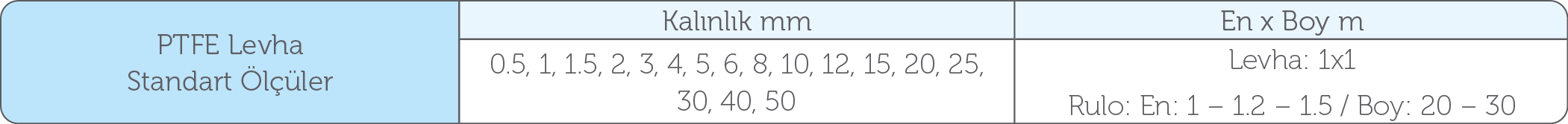 PTFE levha granül reçinenin kalıpta preslenmesi ve sinterlenmesi ile imal edilir. Mükemmel fiziksel ve kimyasal özellikleri ile , -180 °C ile 260 °C arasında geniş bir kullanım alanına sahiptir. PTFE cam elyafı, karbon, grafit, molibden disülfat ve bronz gibi malzemelerle takviye edilerek mekanik özellikleri iyileştirilebilir. Alaşım malzemeleri PTFE’nin mekanik dayanımını, stabilitesini ve aşınma direncini artırırken, diğer özelliklerini olumsuz yönde etkilemez. Kimyasal korozyona dirençli olması, hava şartlarına dayanıklılık, dielektrik özelliğinin mükemmel olması, yüksek kayganlık, yapışmaması ve kolay zarar görmemesi gibi üstünlüklere sahiptir.