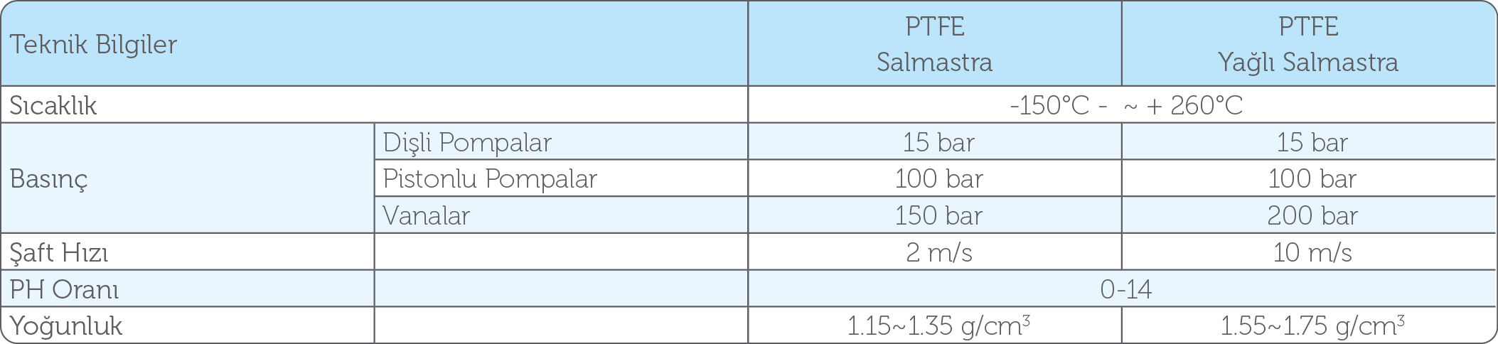 PTFE salmastraları mükemmel korozyon direnci, kendinden yağlama ve yapışmama özelliklerine sahiptir. Bu malzeme aynı zamanda düşük ısıl kapasitesine, soğukta akış kabiliyetine ve büyük termal genleşme özelliğine sahip bir malzemedir.
