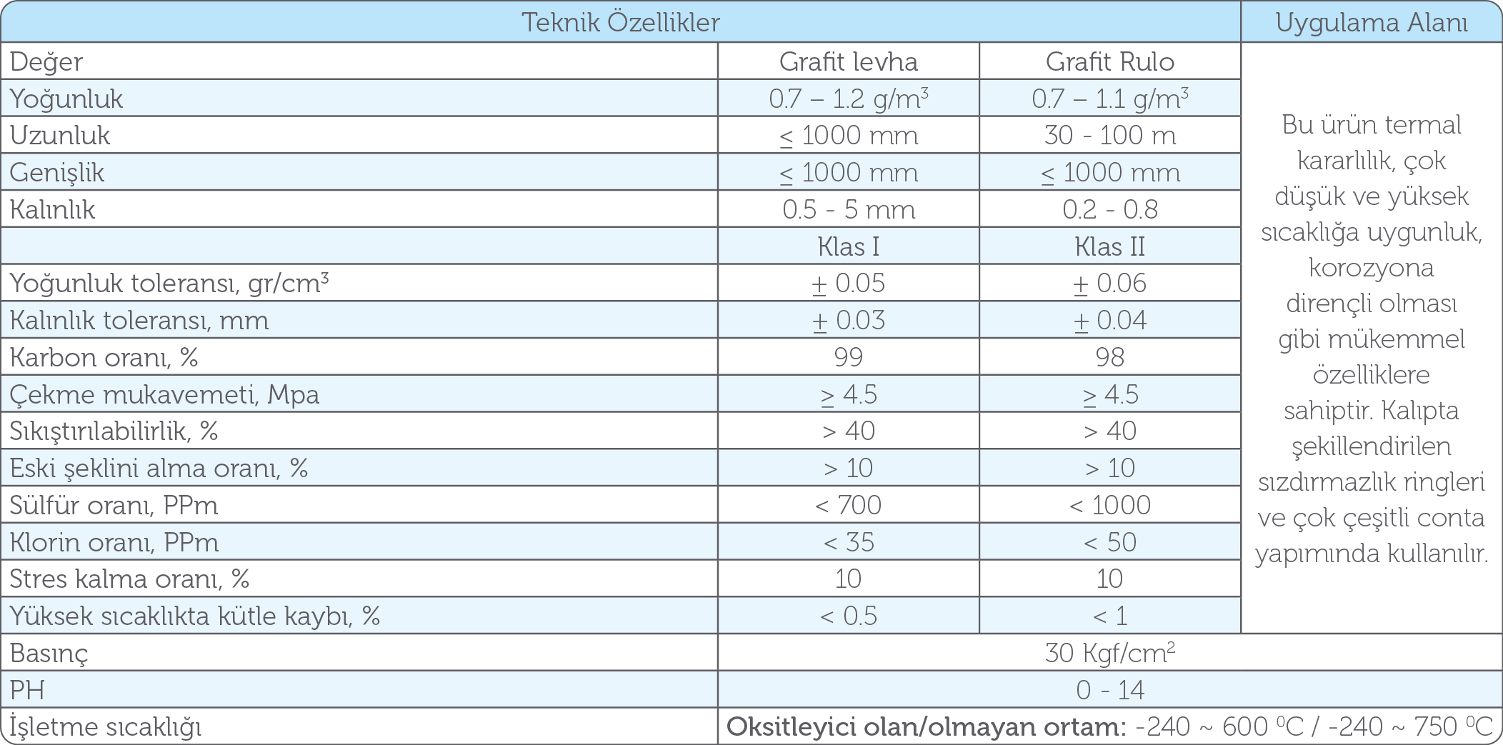 Esnek Grafit Levha kabartılmış saf mineral grafit ile yapılır. Grafit levhalarımız % 99 karbon saflığındadır. Yüksek karbon safiyeti esnek grafit levhaya, daha iyi kimyasal direnç, daha iyi termal geçirgenlik ve daha iyi sızdırmazlık özelliği sağlar. Conta malzemesi olarak, grafit katmanlar halinde veya takviyeli grafit levha olarak üretilir ve yaygın olarak akışkan sızdırmazlığı alanlarında kullanılır. Bu malzeme metal kesme ve şekillendirme işlemlerinde katı yağlayıcı olarak, endüstriyel fırınlarda ve diğer ısıl işlem tezgâhlarında ısı yalıtım malzemesi olarak kullanılabilir.