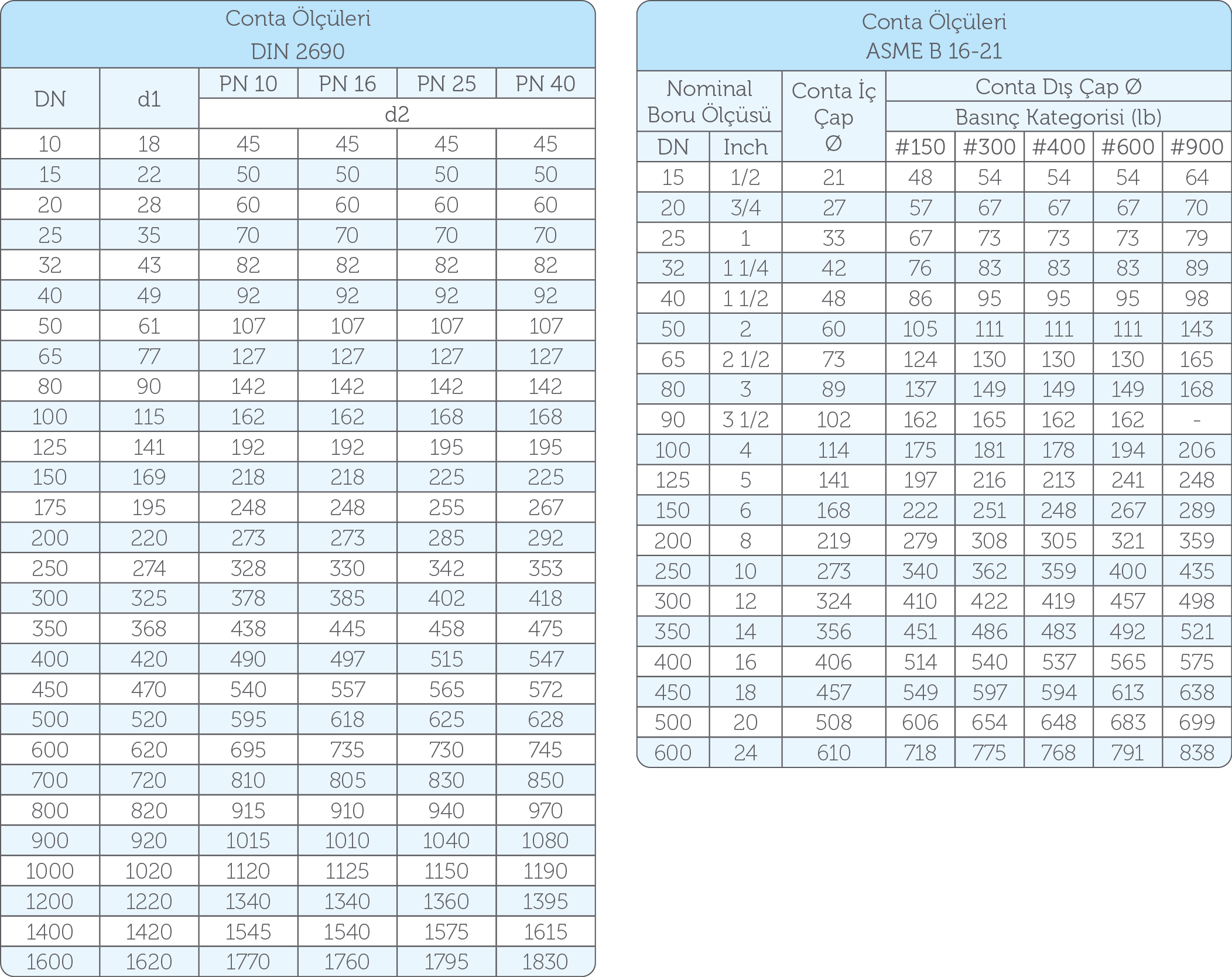 Kendi üretim tesislerimizde uluslararası standartlara uygun vana ve flanş contaları üretilmektedir. Kataloğumuzda tanıtılan mamul conta malzemelerinden standart ölçülerde (15 ~ 1000 mm) ve daha büyük standart dışı özel ölçülerde conta imalatı mümkündür.